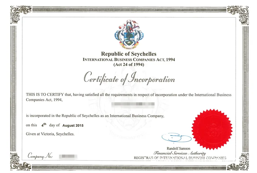 (塞舌爾公司注冊(cè)證書樣本)