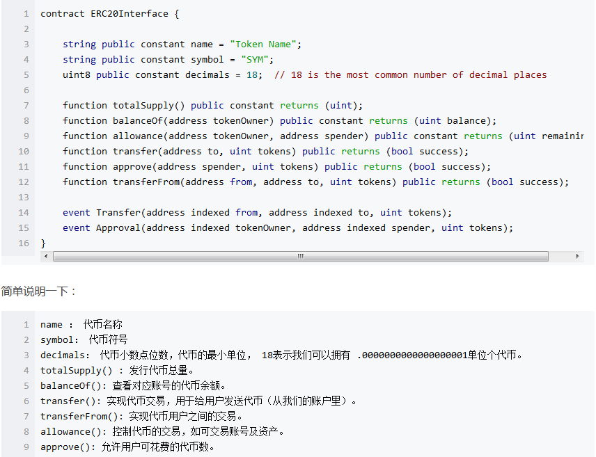 這里也介紹一下ERC20,這是以太坊定義的令牌標(biāo)準(zhǔn)。這個(gè)標(biāo)準(zhǔn)要求我們在實(shí)現(xiàn)代幣時(shí)必須遵守約定。只有支持協(xié)議,才能得到以太坊錢包的支持。下面是協(xié)議代碼界面??床欢矝]關(guān)系。程序員就能搞定。
